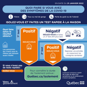 Voici deux documents sur les actions à prendre en cas de symptômes de la COVID-19 et la durée de l’isolement requis, en fonction de votre situation.